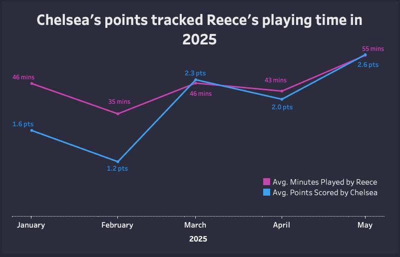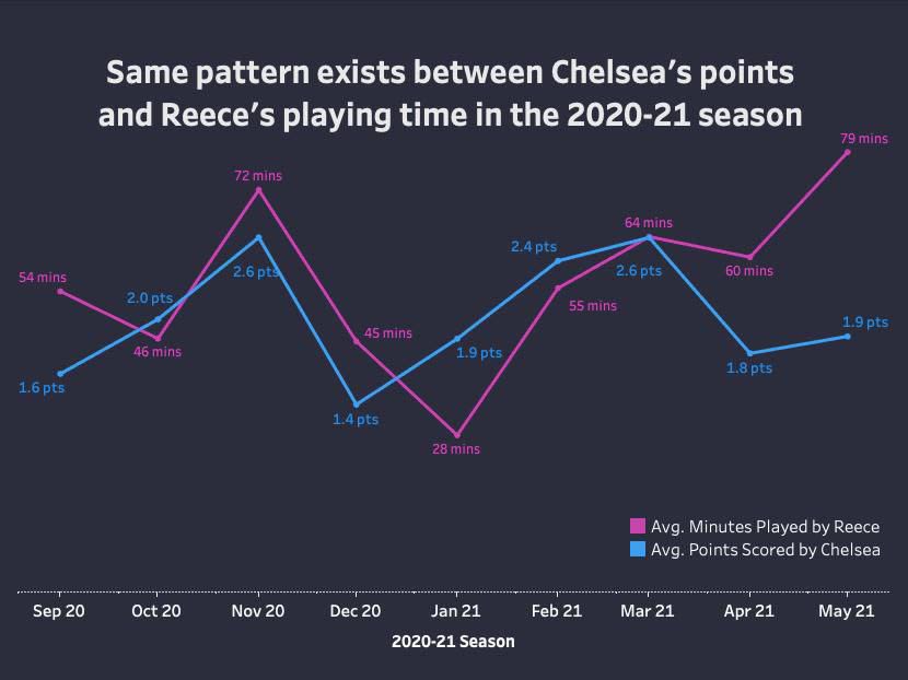 A similar pattern emerges when we examine the data from the 2020-21 season – the very year when Chelsea won the UEFA Champions League. The average points scored per month track the average minutes played by Reece during the same period. Yes, correlation is not causation, and perhaps Reece’s playing time has little direct impact on the club's point tally. But, the alignment between the two lines is hard to ignore.