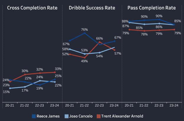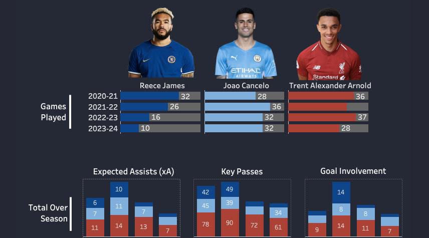Reece James’s impact at Chelsea becomes clearer when we examine two key performance metrics from the 2020–21 and 2021–22 seasons: Expected Goals (xG) and Expected Goals Allowed (xGA).