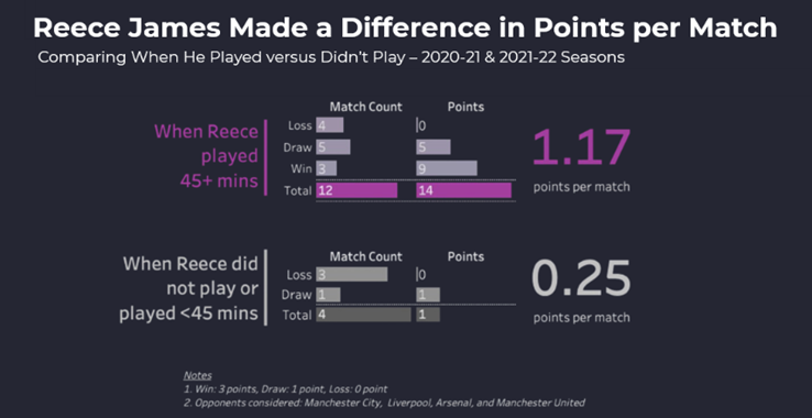 During this period, Reece’s game-time impact can be assessed by looking at Chelsea’s average points per month against Reece’s average minutes played per month. We assigned 3 points for every win, 1 point for a draw, and 0 for a loss, and calculated across all competitions Chelsea played in. A striking correlation can be observed between the two metrics, with average points following the trajectory of Reece’s playing time. For instance, Chelsea scored 1.6 points per match in January, which went down to 1.2 points per match in February as Reece’s average minutes played per match dropped from 46 to 35 minutes. The closeness of points scored and Reece’s playing time could suggest not only how dependent the team is on Reece, but also how effective they are in winning matches with him in the line-up.